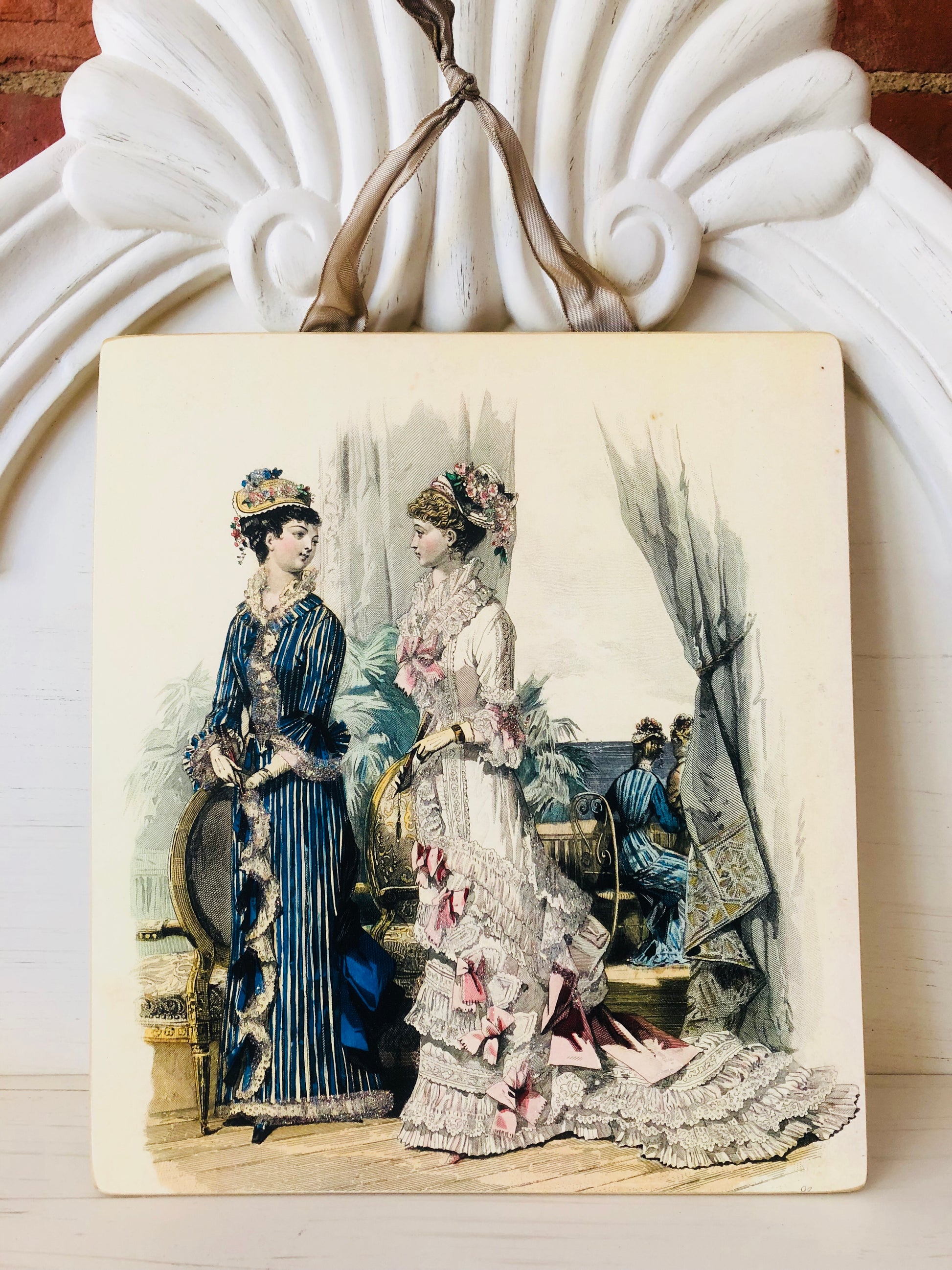 This hand-glittered fashion plate print from Moonlight & Roses is a delightful addition for your boudoir. Measures 10.5” wide and 12” tall. Has a wired ribbon hanger.
