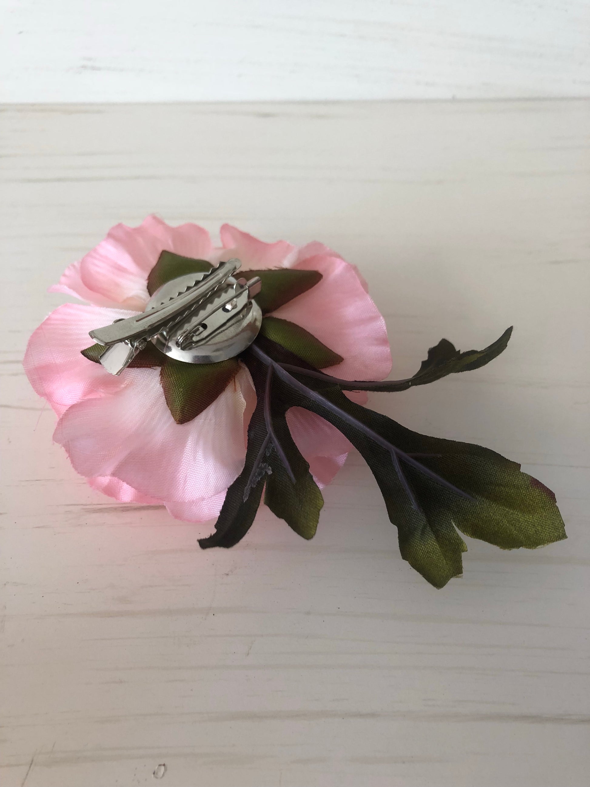 This flower can be worn as either a clip or a pin. Flower is 3.5” in diameter and the green leaf adds 1.5”.
