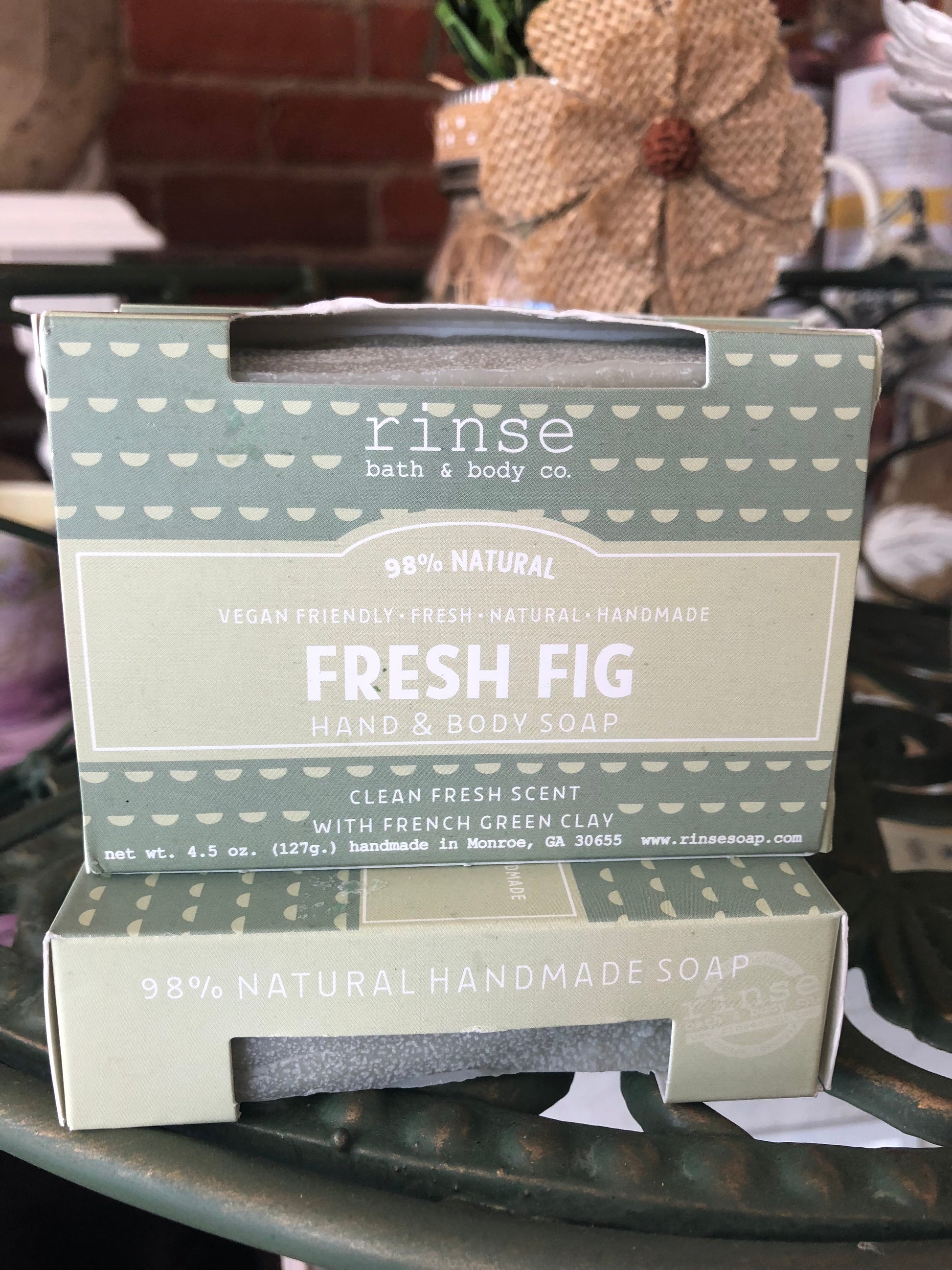 We love Rinse soaps! Fresh Fig is one of our favorites. From Rinse: “A refreshing subtle sweetness of fig blended with a crisp clean scent. Fresh Fig is our most soap smelling scent. The soap is blended & topped with skin-loving french green clay. Contains a saponified blend of Shea Butter, Cocoa Butter, Olive Oil, Refined Sweet Almond Oil, High Oleic Sunflower Oil, Coconut Oil & responsibly sourced Palm Kernel Oil along with French Green Clay & Fragrance Oil. Great as a hand & body soap. 98% natural, vegan friendly. Approx. 4.5 oz.”