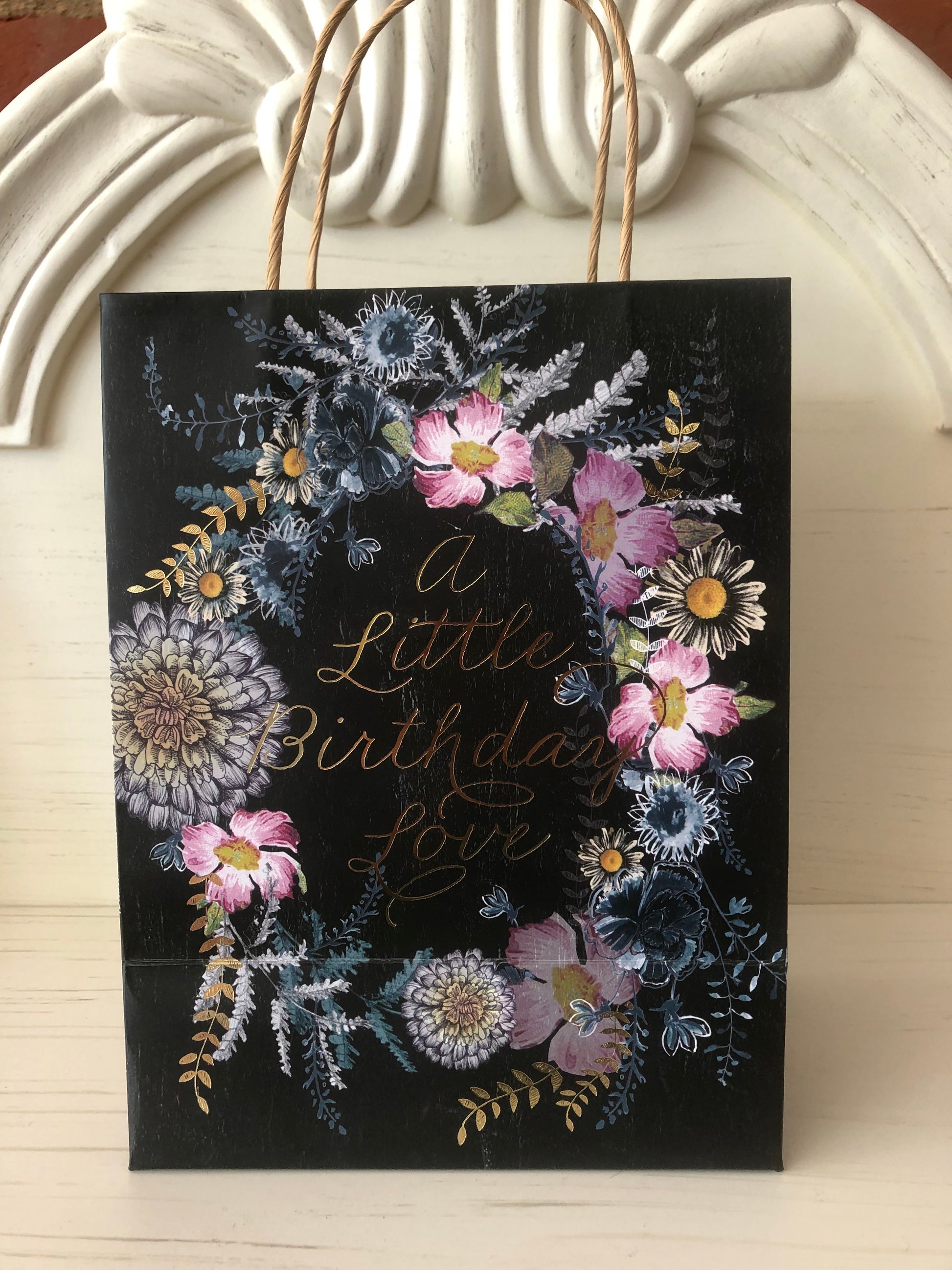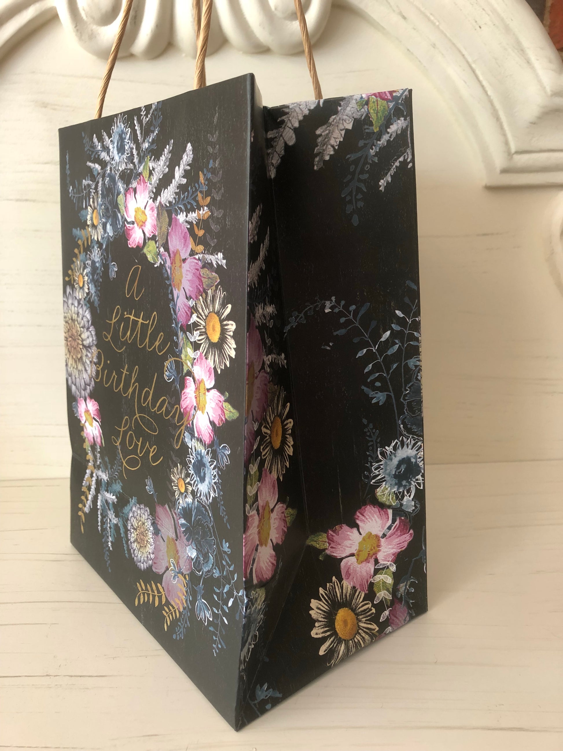 A bag as pretty as the gift! Measures 10” x 7.75” x 4.75“. Sturdy paper, luscious artwork.