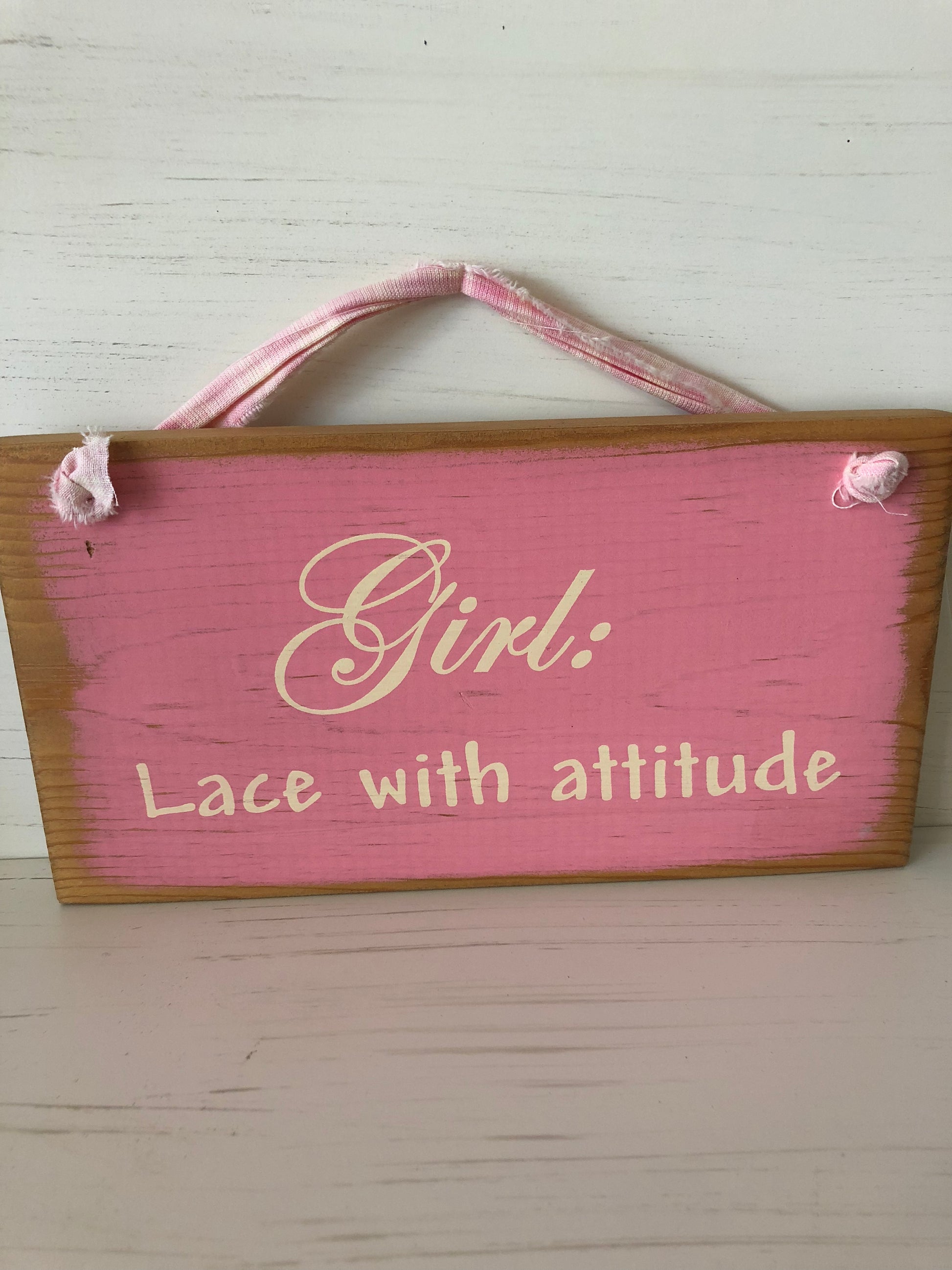 The perfect sign for the sassy lady in your life! Made of wood. Measures 10” x 5.5” and hangs from a cloth ribbon.