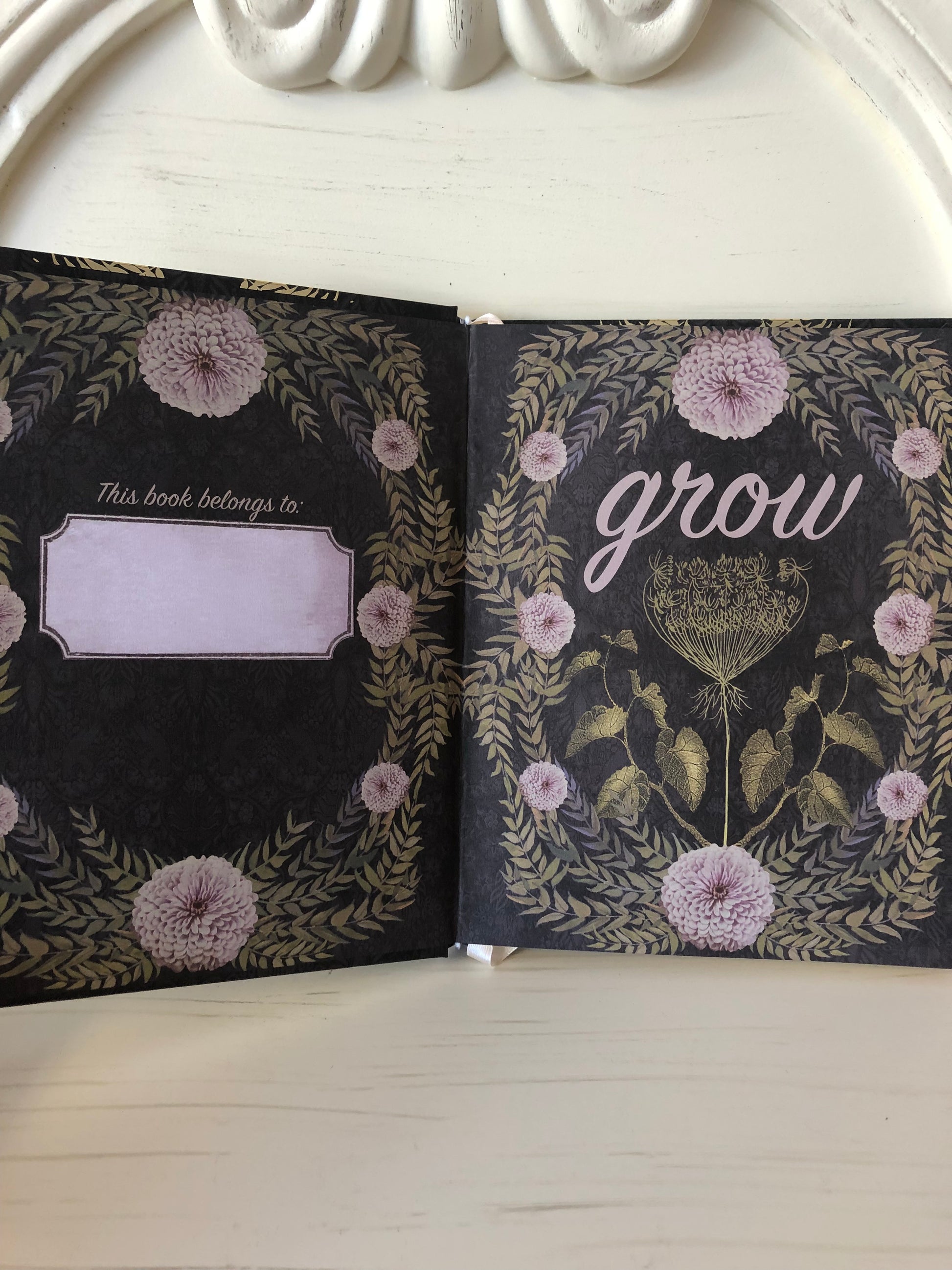 Gorgeous hard-covered notebook, measures 7”x9” and features decorated and gold-edged pages.