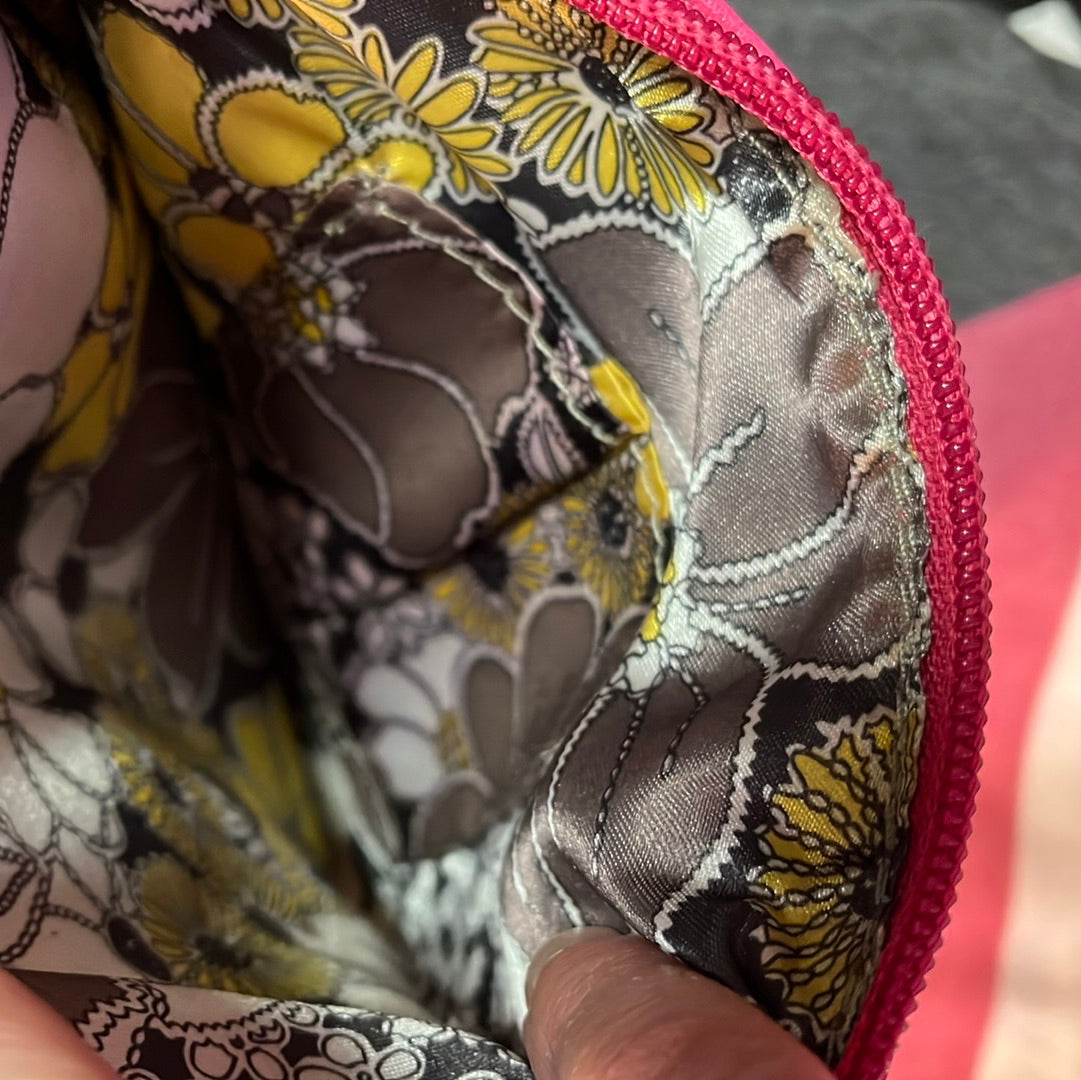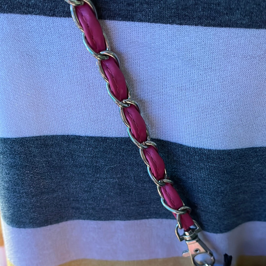 Perfect spring bag, this hot pink rosette hipster features a chain strap and eye-catching rosette on the front. One zip pocket in the back. Two slip in pockets inside. Vibrant satin lining.