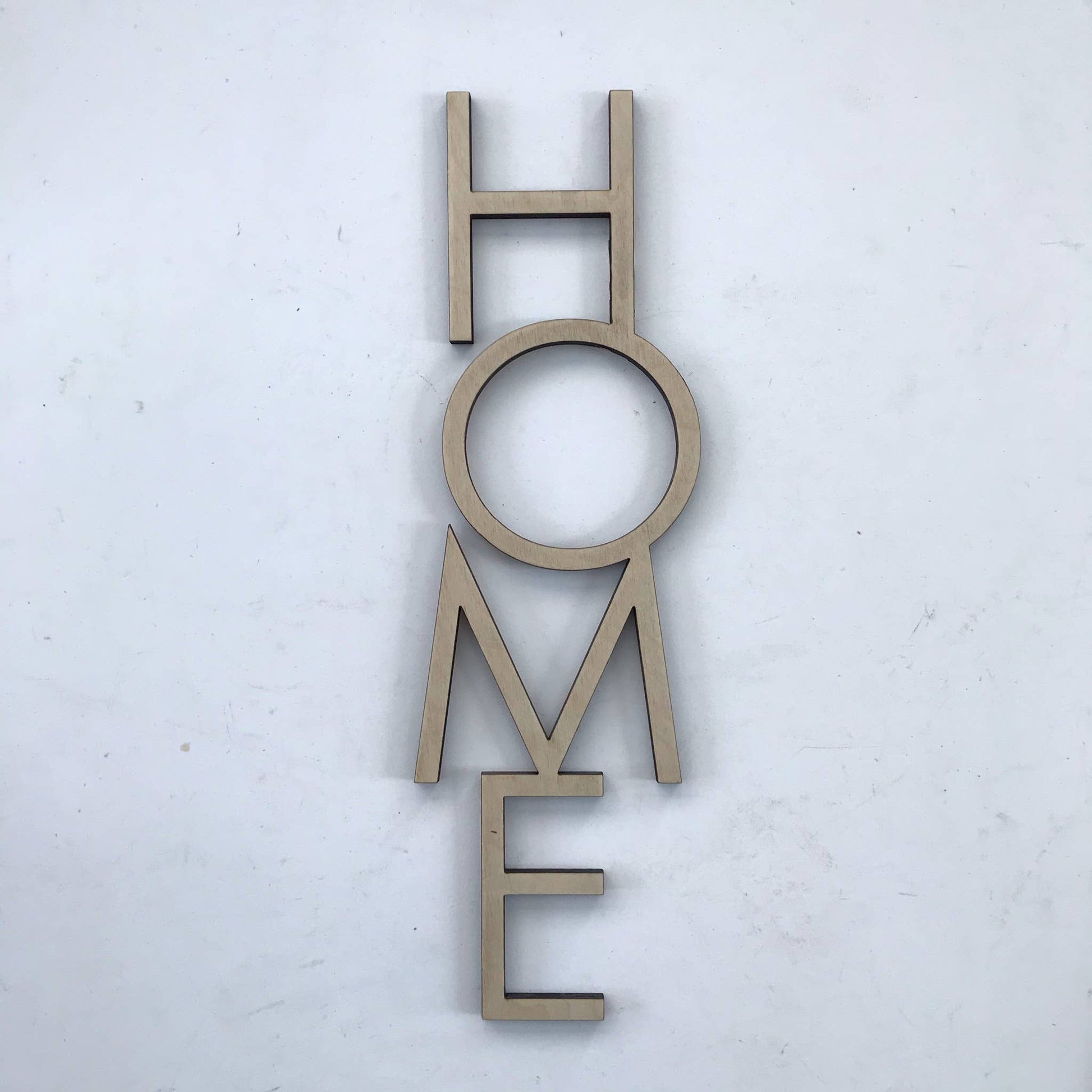 We love this contemporary "HOME" as a vertical addition to a gallery wall or mantle! Lasercut from 1/4" wood, this piece is sturdy enough to hang on it's own, but light enough to use an adhesive strip or tiny nail. Measuring about 14" high, these pieces are offered in a natural wood color and matte black.