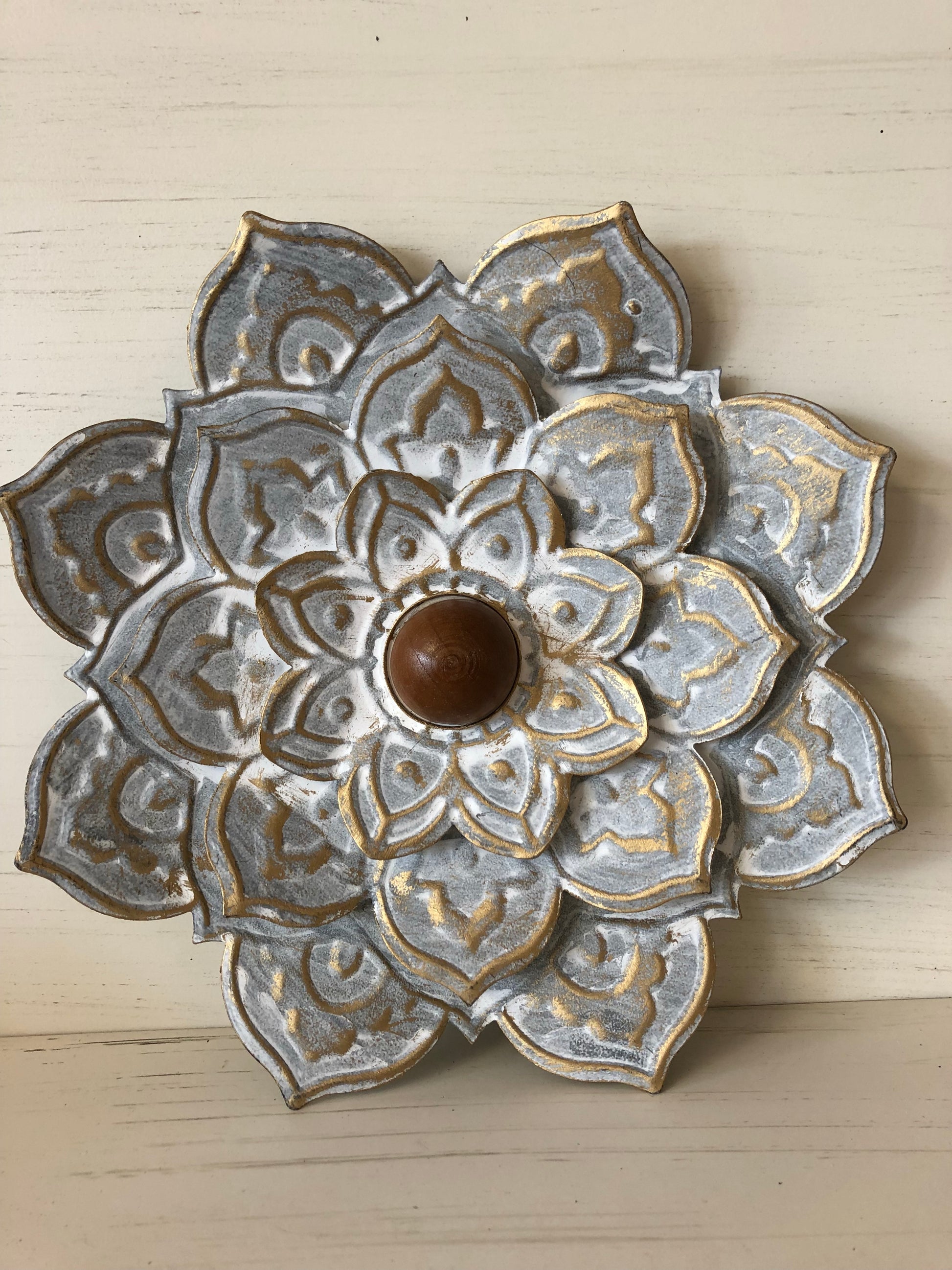Metal petals and a wood center make up this interesting wall accent flower. Measures 8.25” in diameter. Great for shabby chic gallery walls!