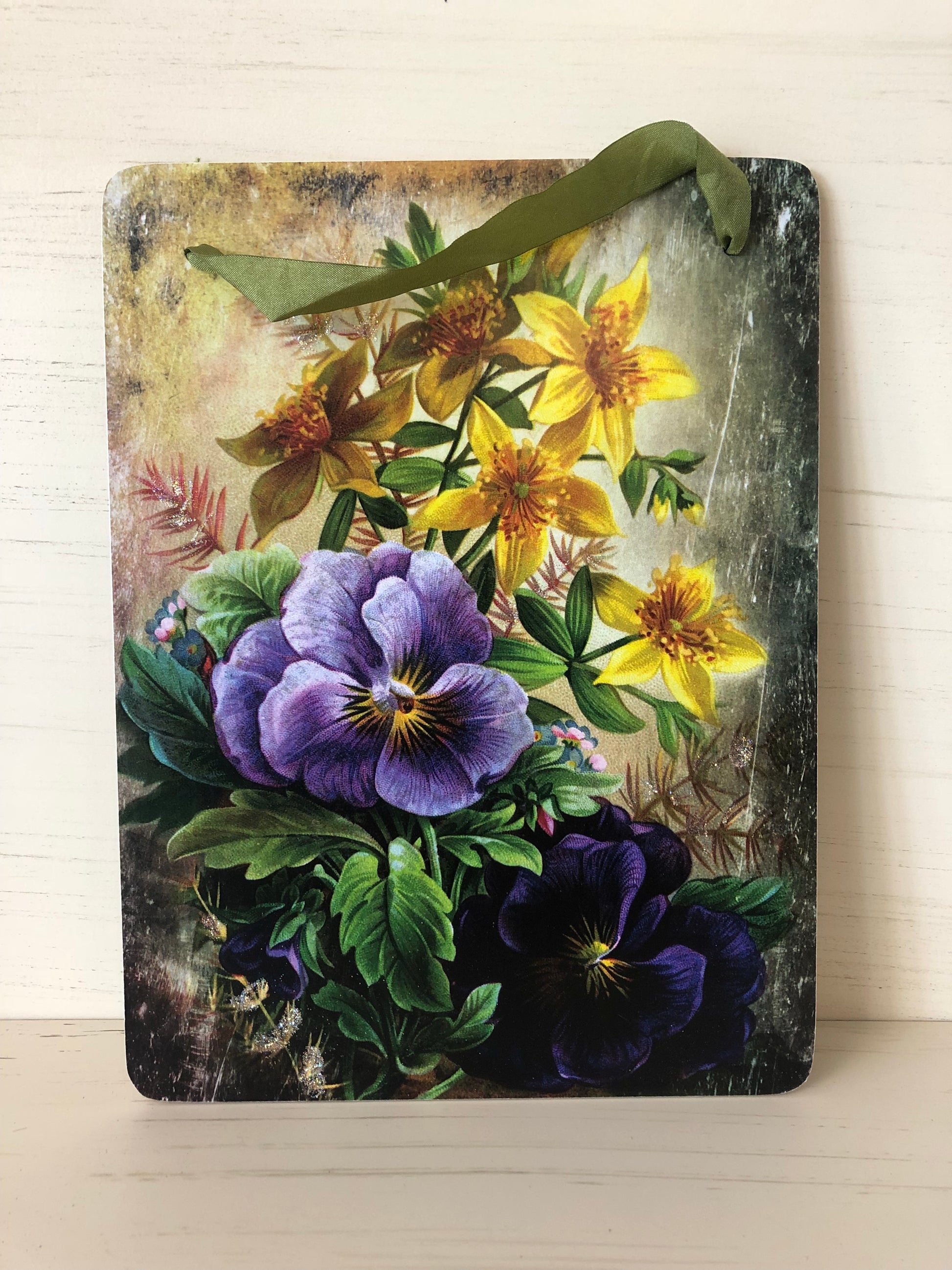 Handmade with glitter accents. Measures 6”x8” with ribbon.