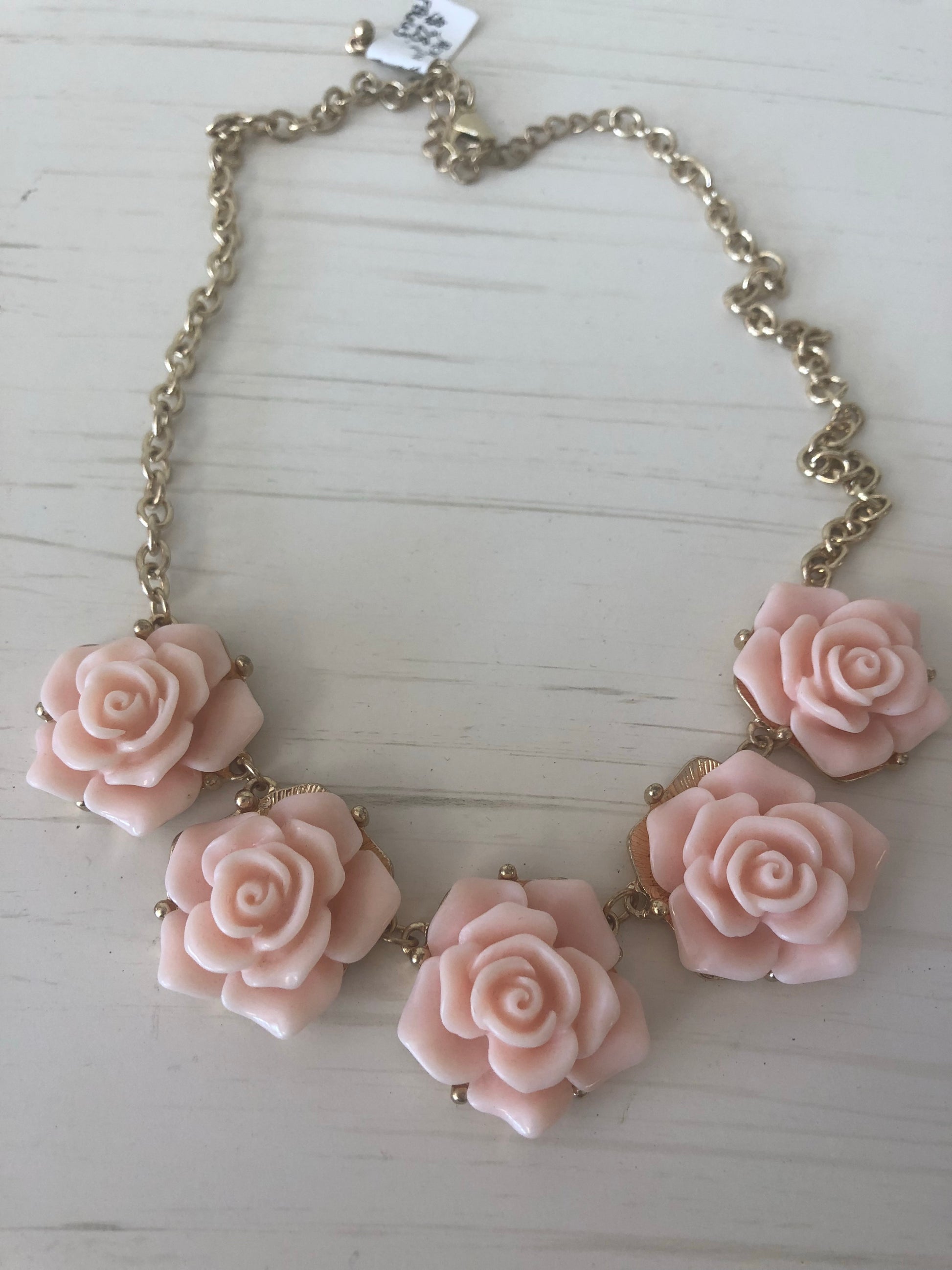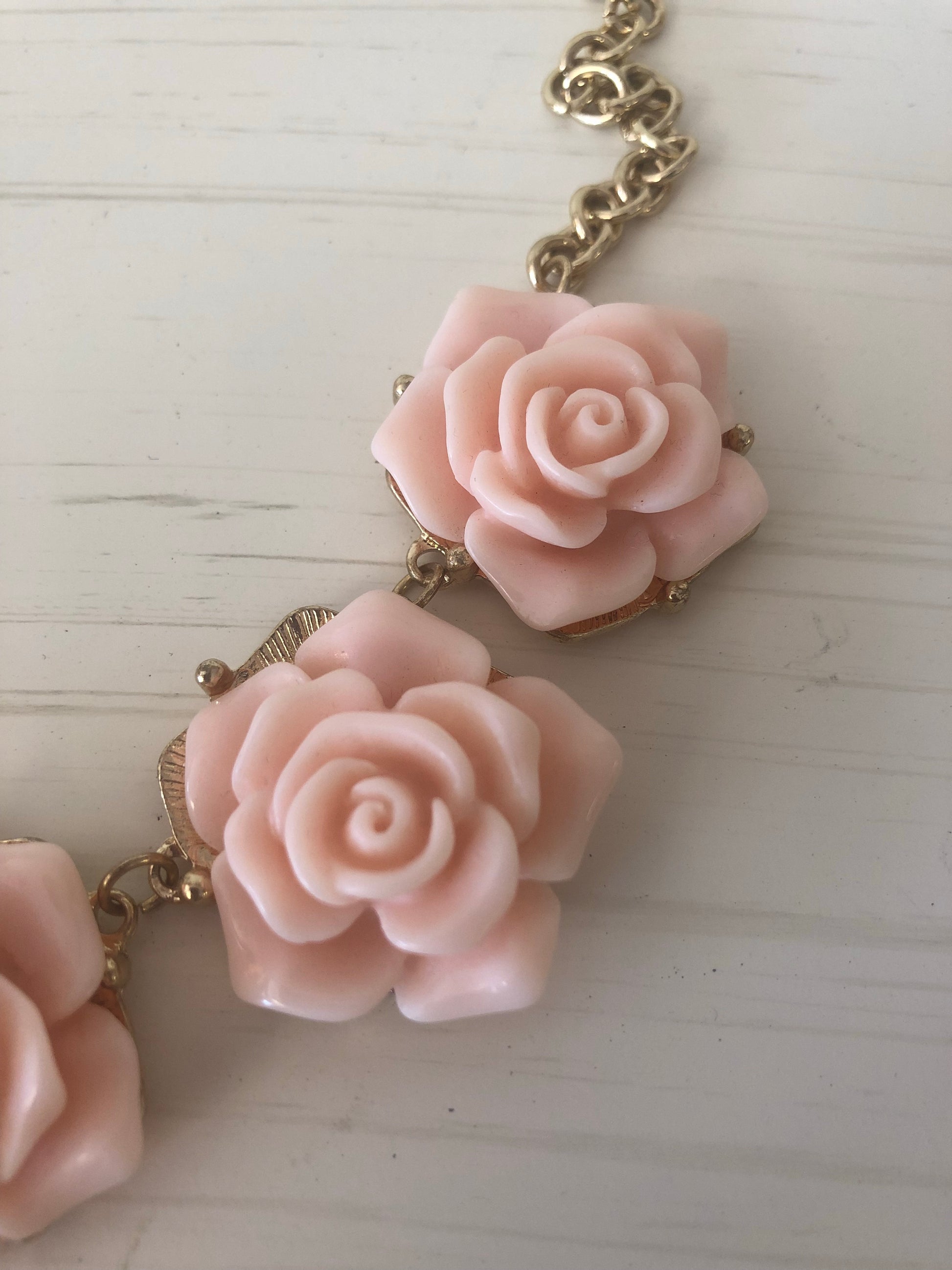 Peachy roses adorn a lovely necklace. Each measures 1” in diameter.
