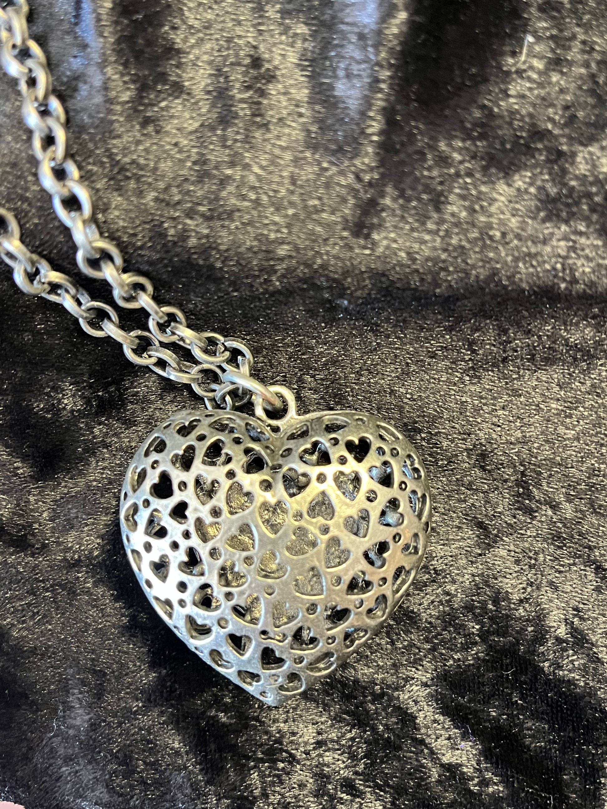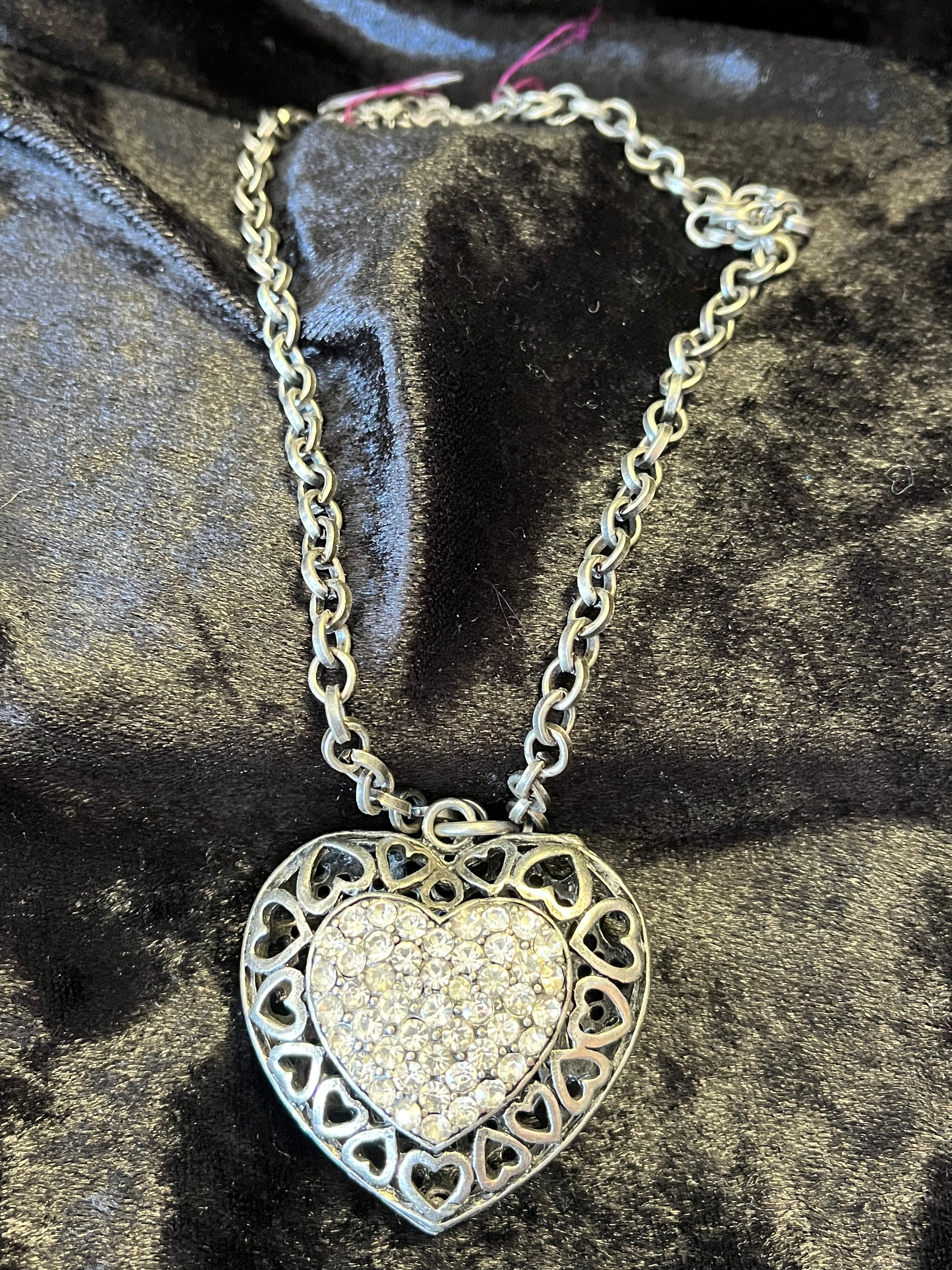 Silver heart necklace embedded with rhinestones, measures 20” in chain length with a 2” heart pendant with charming detail on the back.
