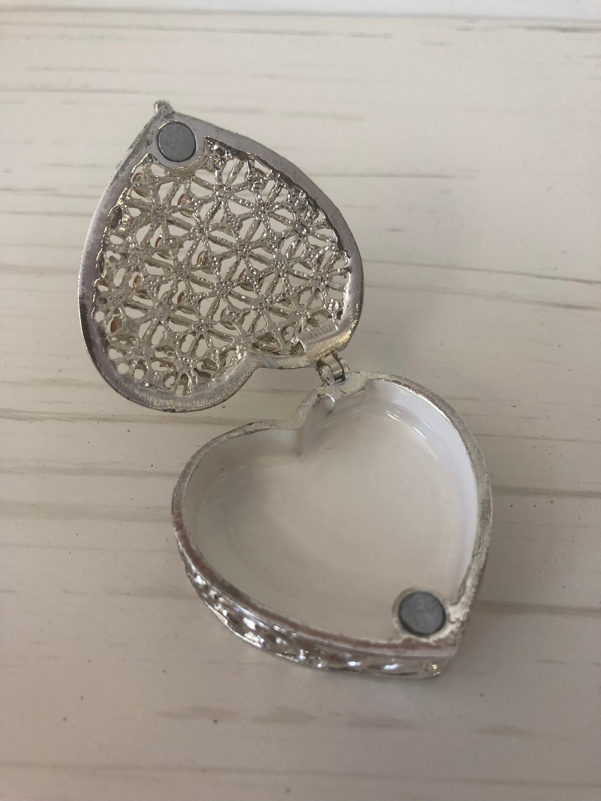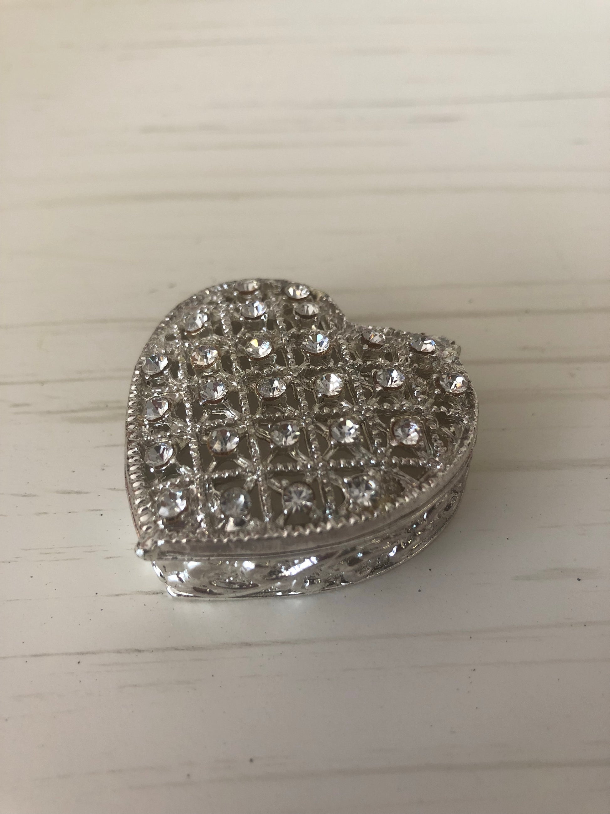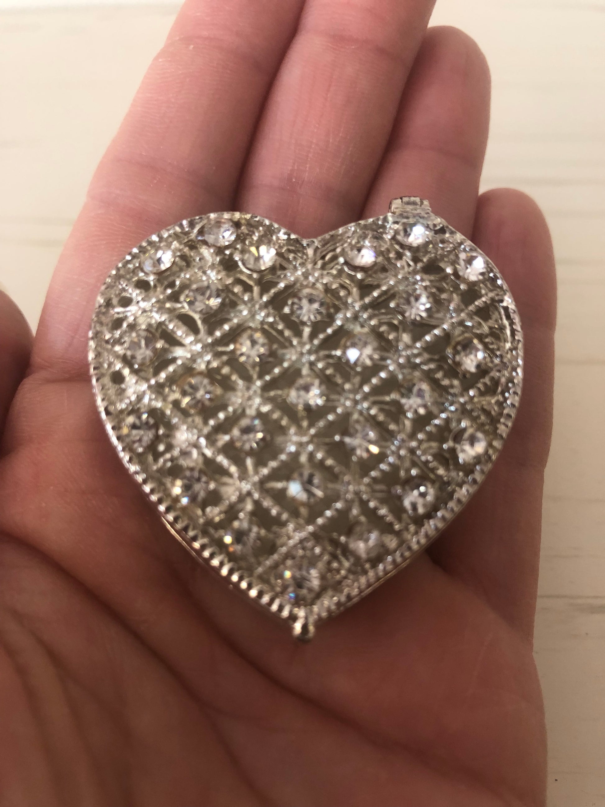 Sweet and shimmery this rhinestone heart box is a heartfelt gift. Measures .5” tall, 1.75” wide at widest part.