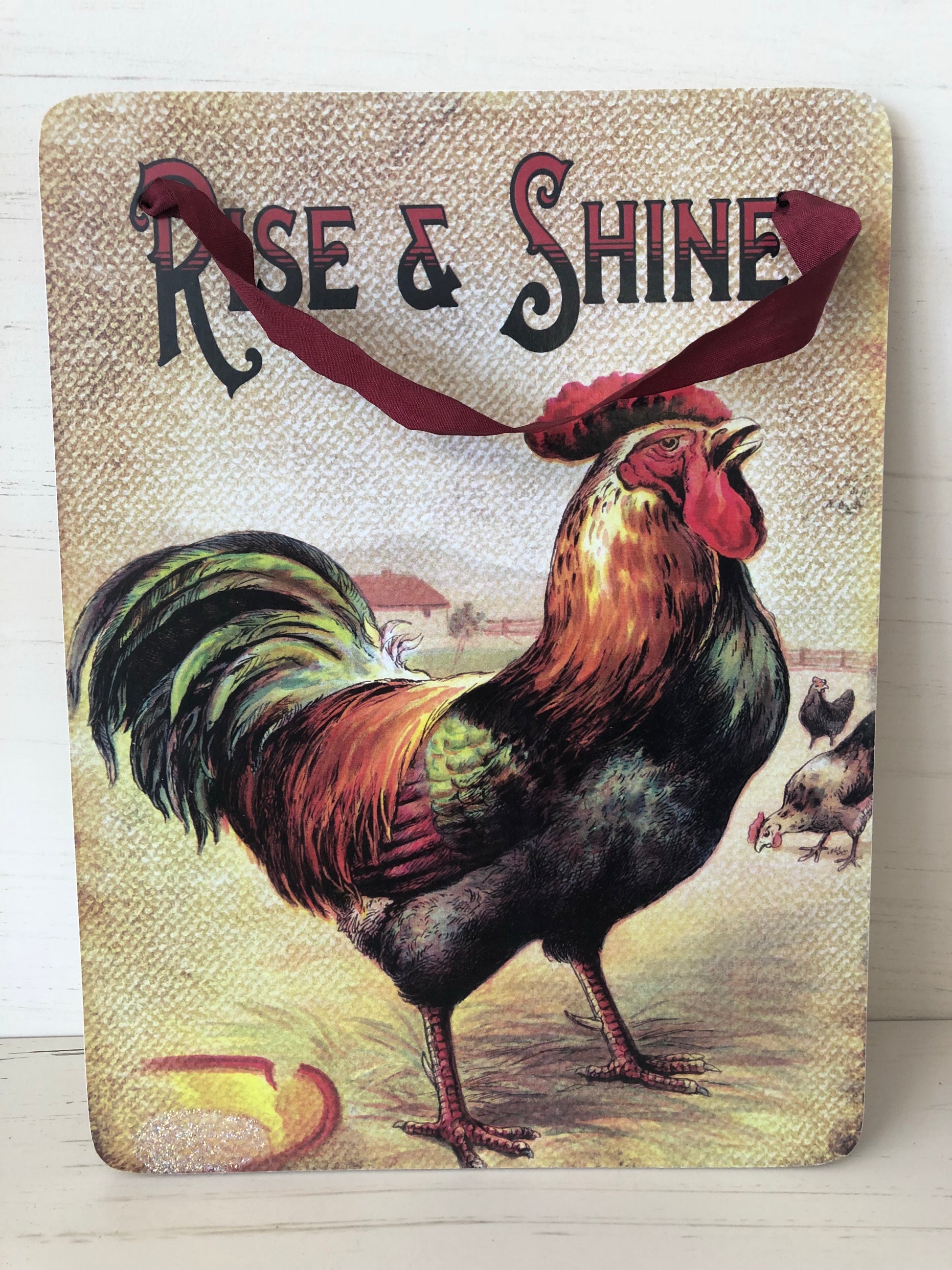 This perky chicken will wake you up. Sign measures 6”x8” with a ribbon hanger.