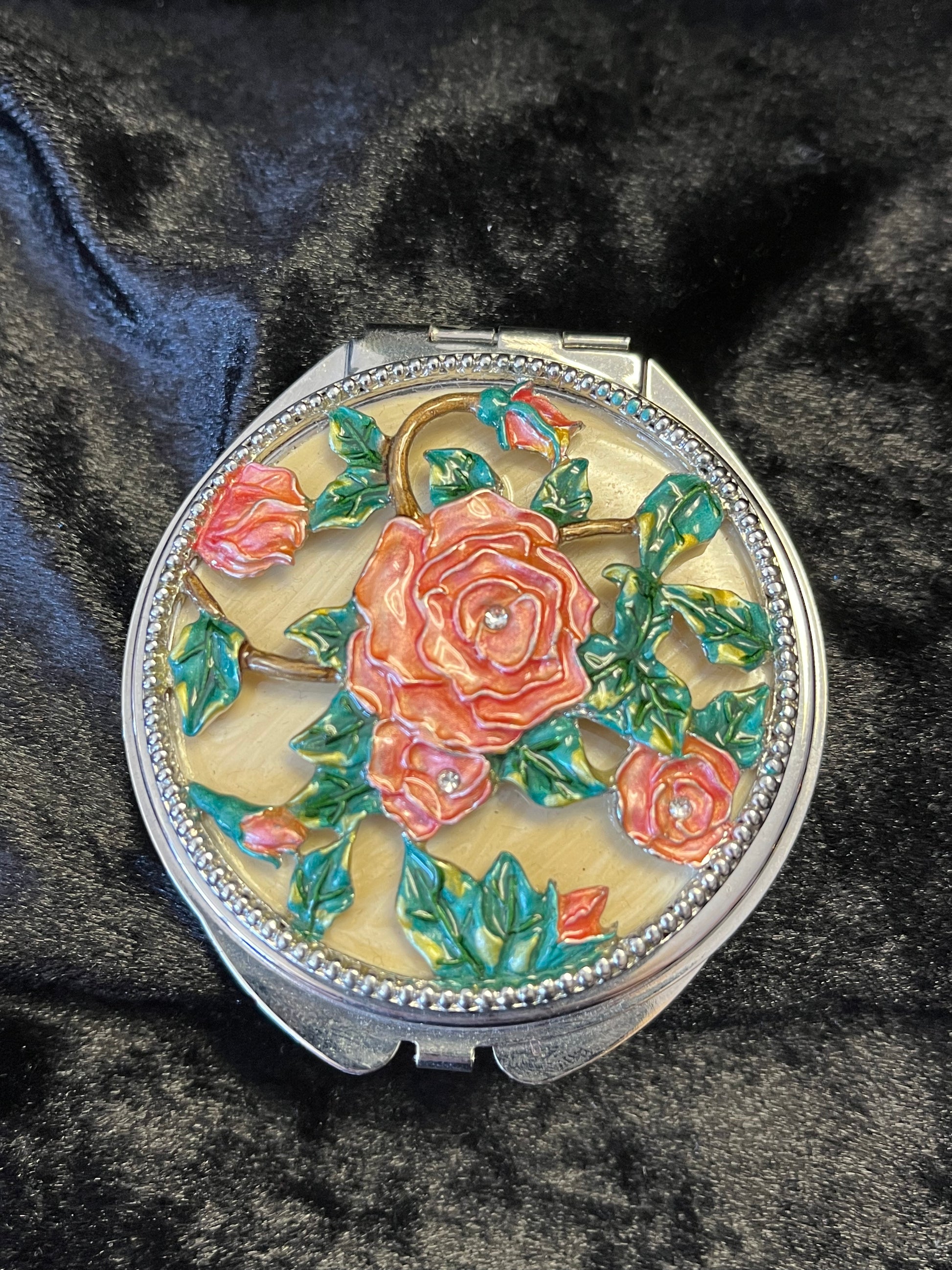 A pretty purse accessory, this mirrored compact is covered with enameled roses and leaves. Measures 2.5” in diameter.