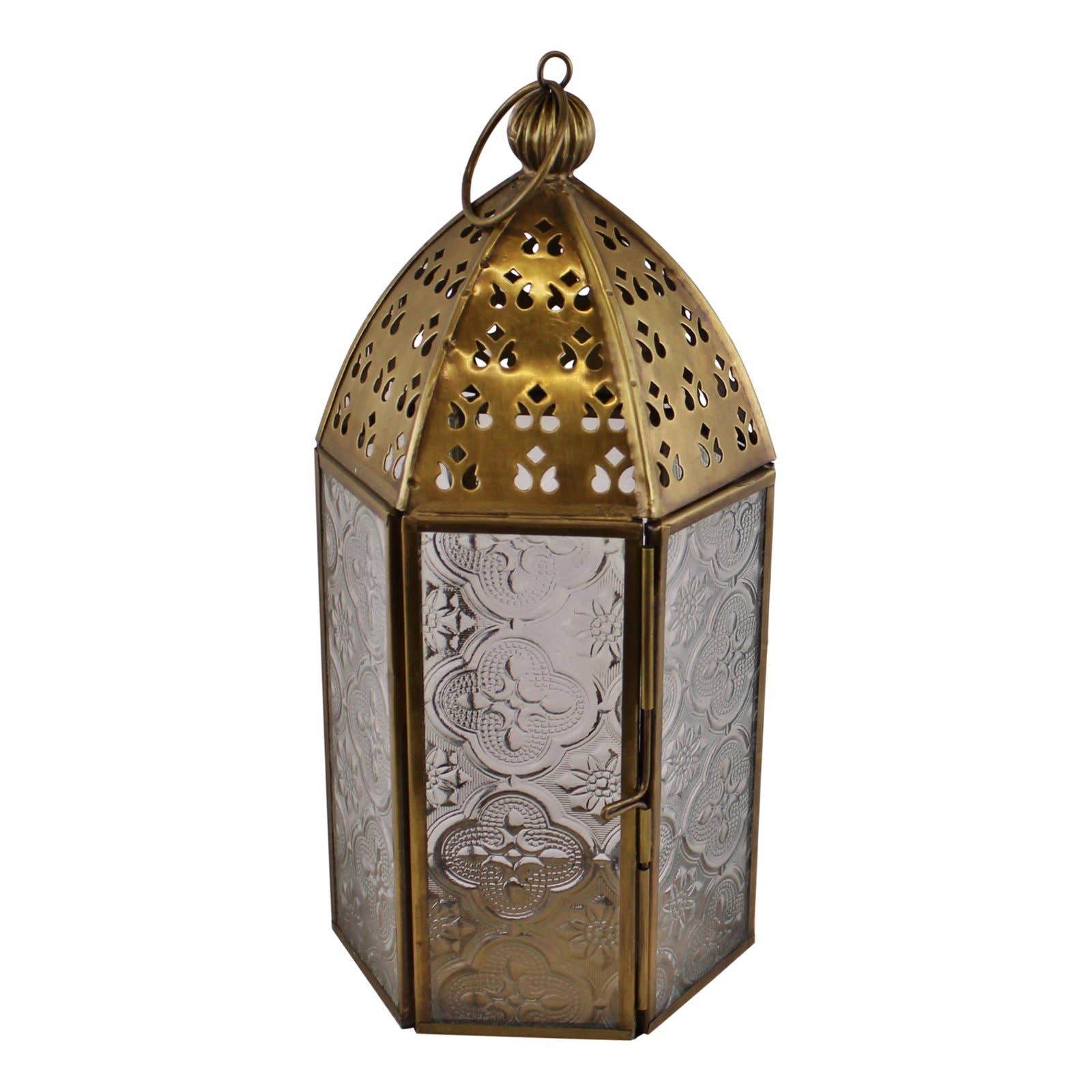 This gorgeous gold and glass lantern adds more than candlelight to your home, intricate cut out metal work brings beautiful patterns when lit and will add the mystery of Morocco to a room or outdoor space. The product can be hung or placed on a tabletop. Made of Iron and glass. Suitable for tealights/votives and small pillar candles. Candle not included. Measurements: 9 x 22 x 10cm