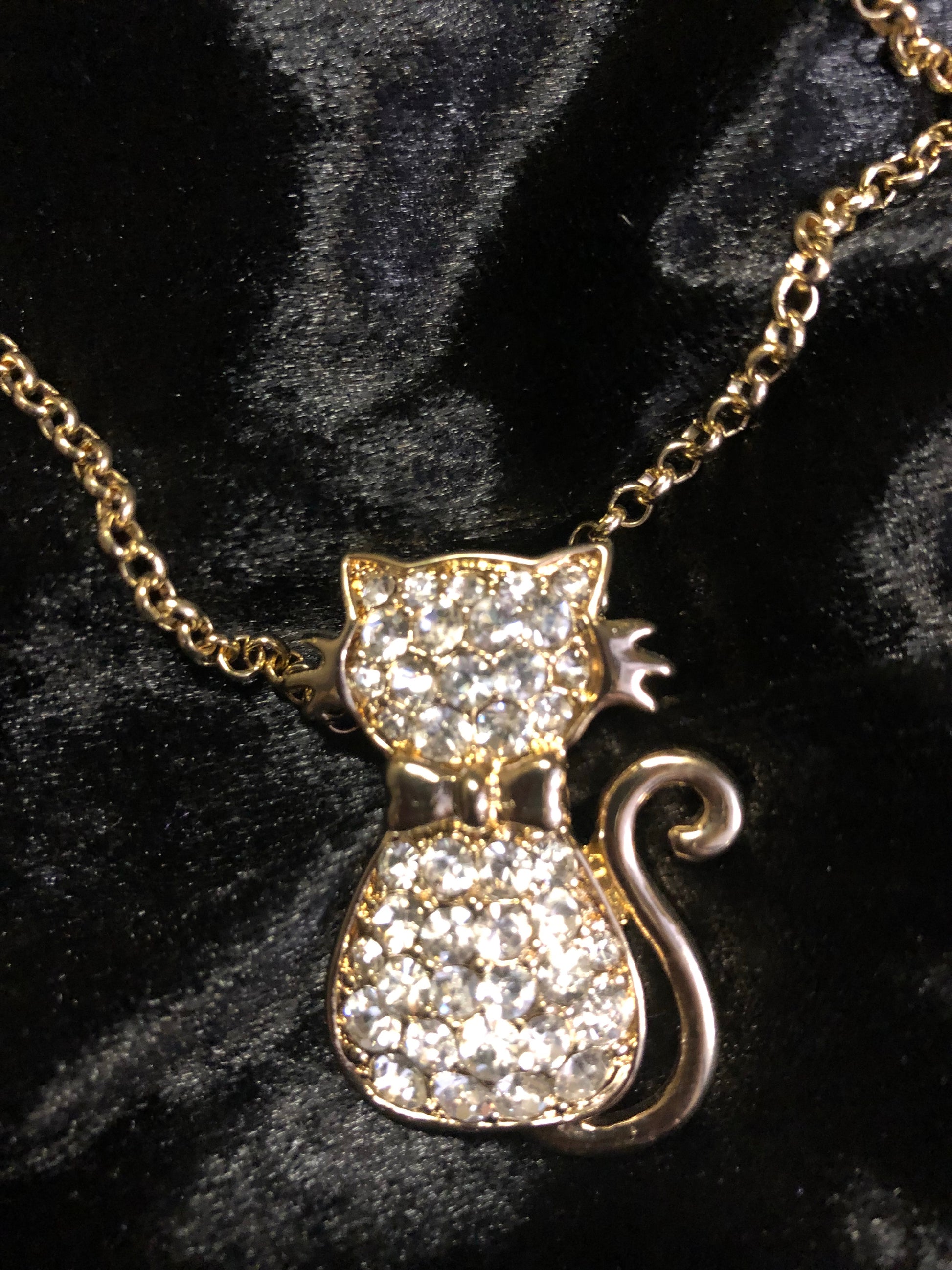 This sparkly rhinestone-encrusted kitty necklace is adorable for any cat-lover! Measures 1.75”x 1” with 18” of chain.