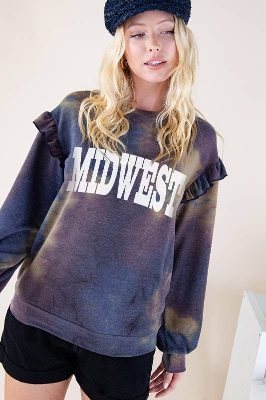 If you like the Midwest best, put this upon your chest! Ha ha. MIDWEST graphic tie dye print french terry long sleeves top with ruffled detail. Shades of blue.
