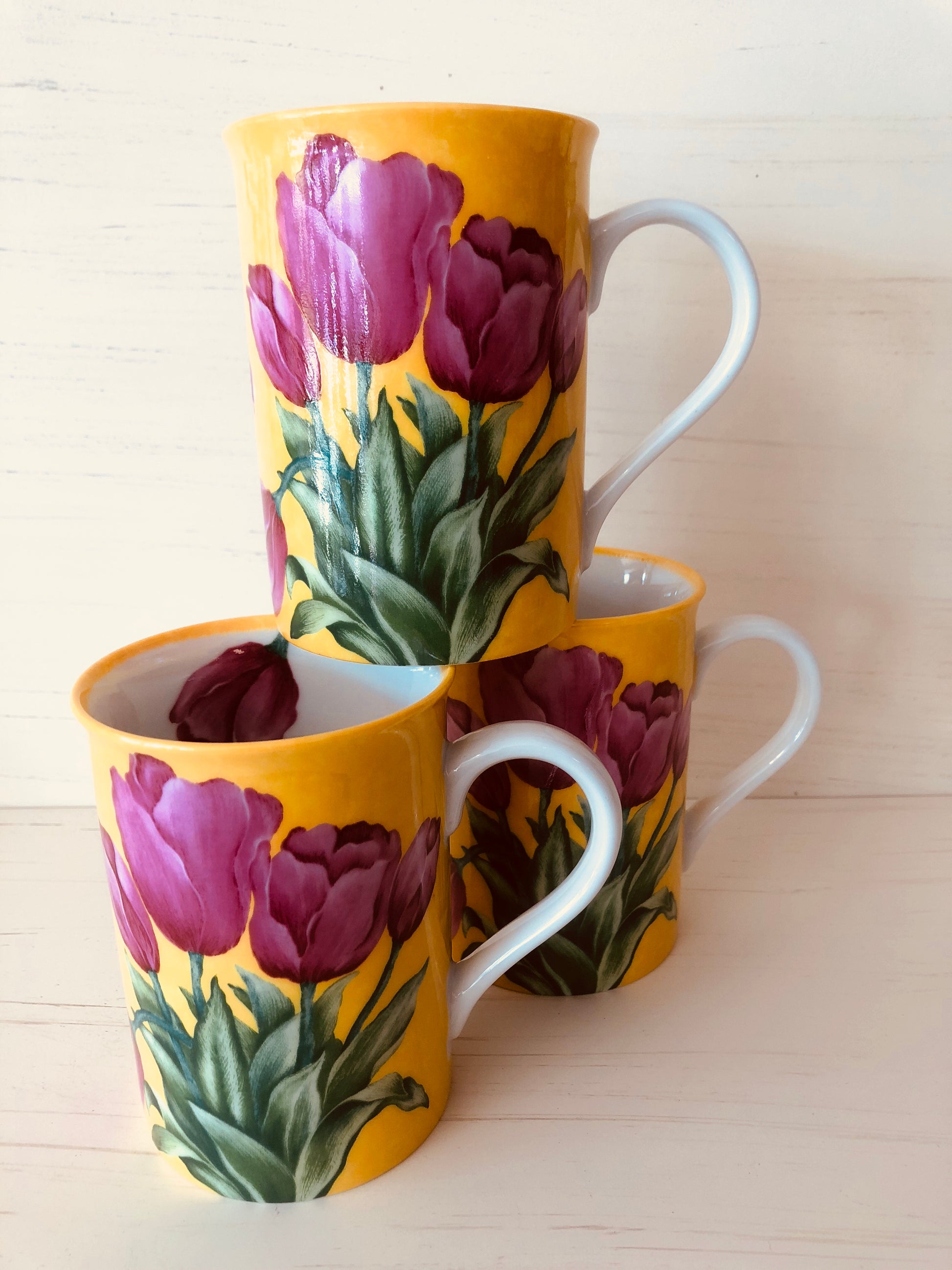 Brilliant spring tulips on a bright yellow backdrop. Handwash, *not* microwavable. 4” tall x 3” diameter.