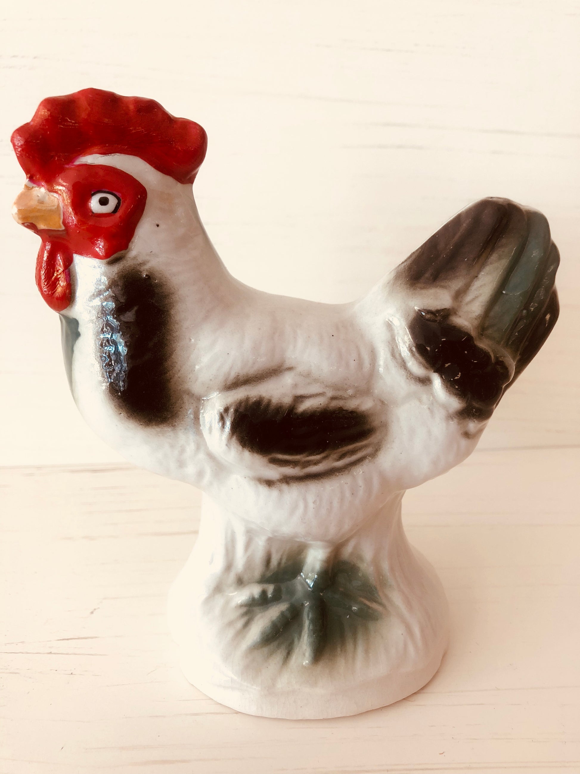 This sweet vintage chicken Measures 5.5” tall x 4.5” beak to tail x just under 3” at base.