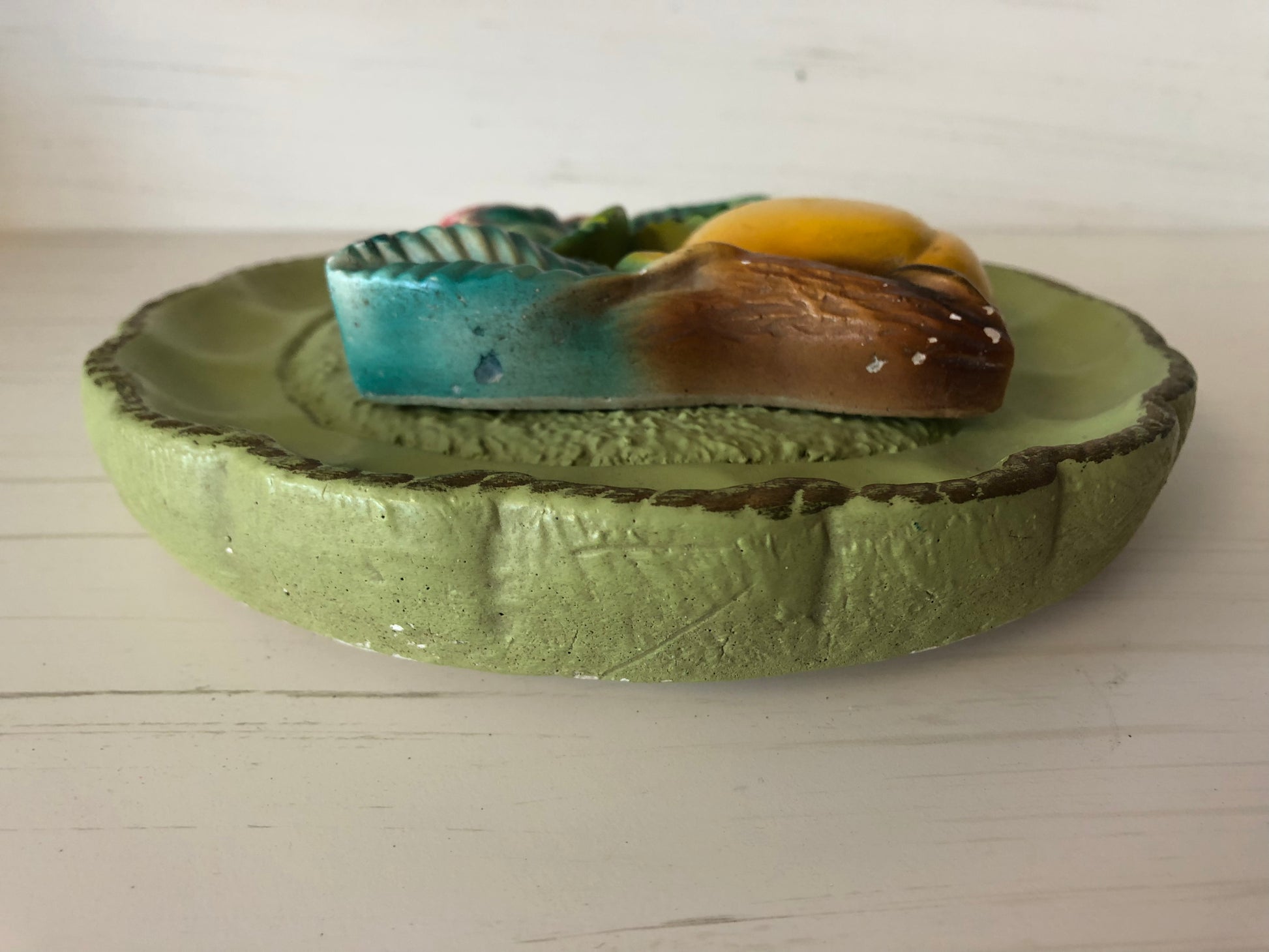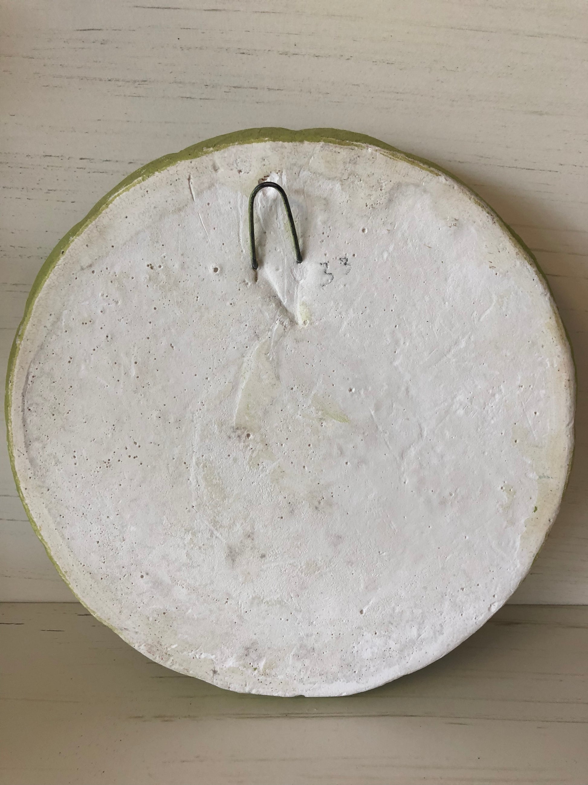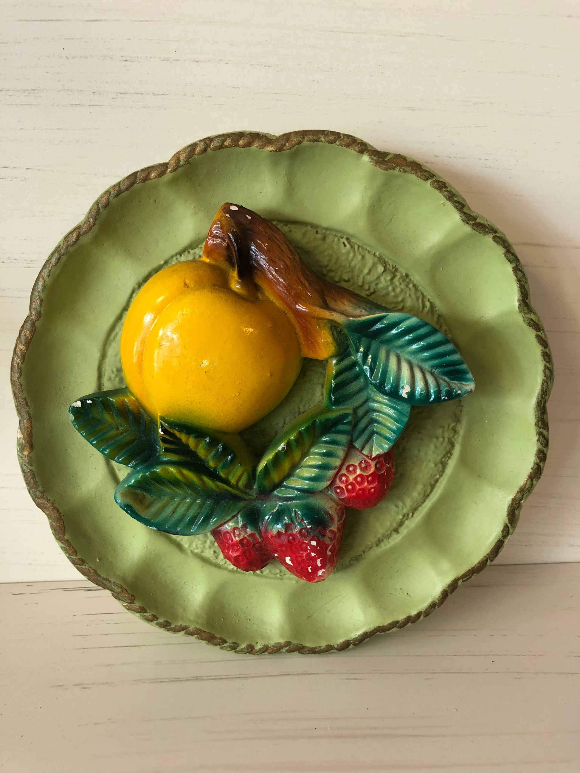 Cute kitchen decor, this vintage chalkware fruit art measures 6.75” in diameter.