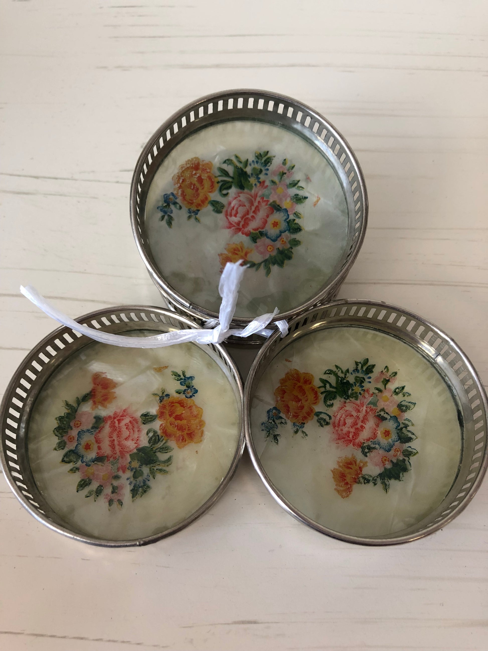 Set of four metal and mother of pearl-appearing coasters with a floral motif. 2.5” in diameter.