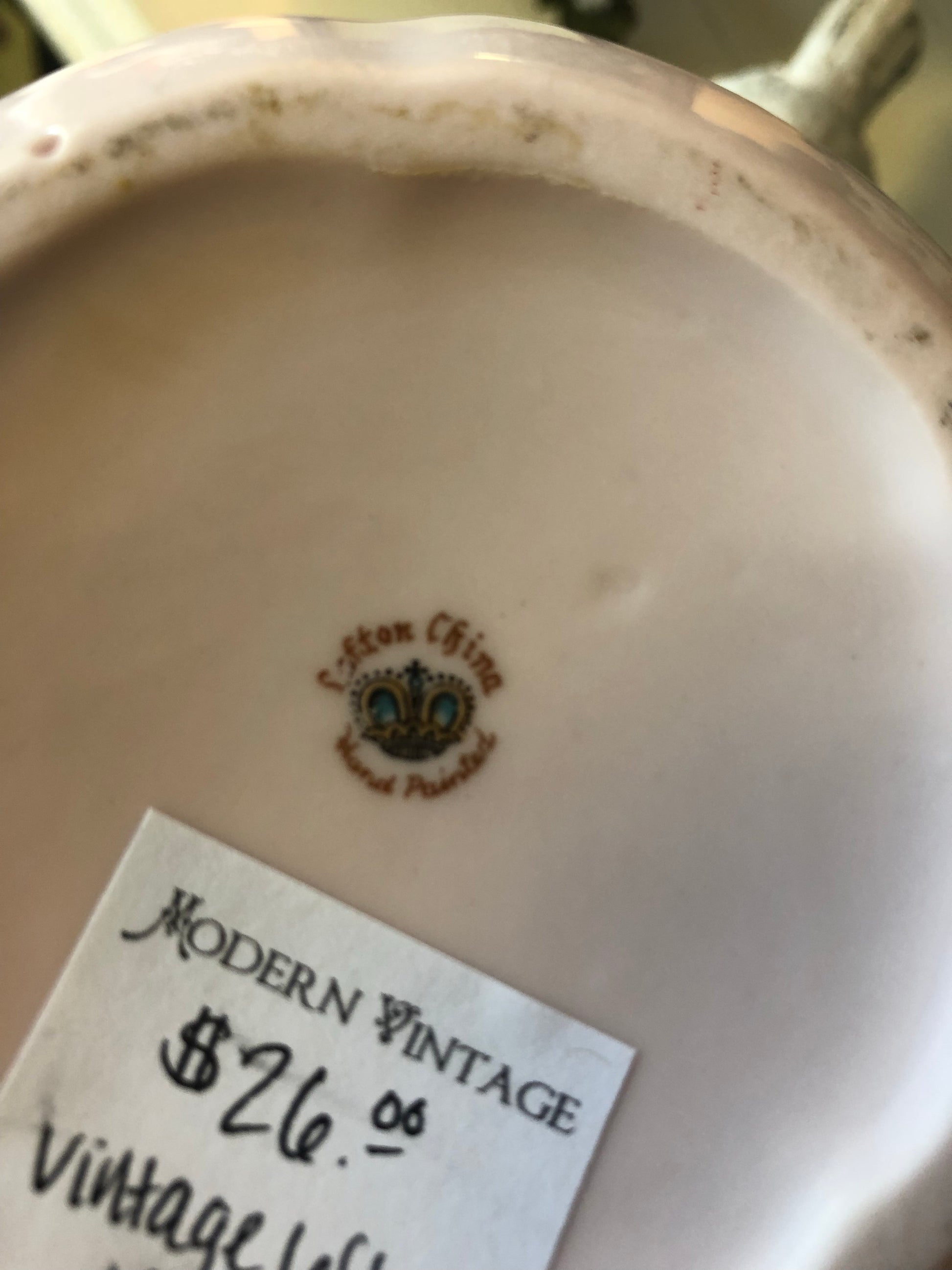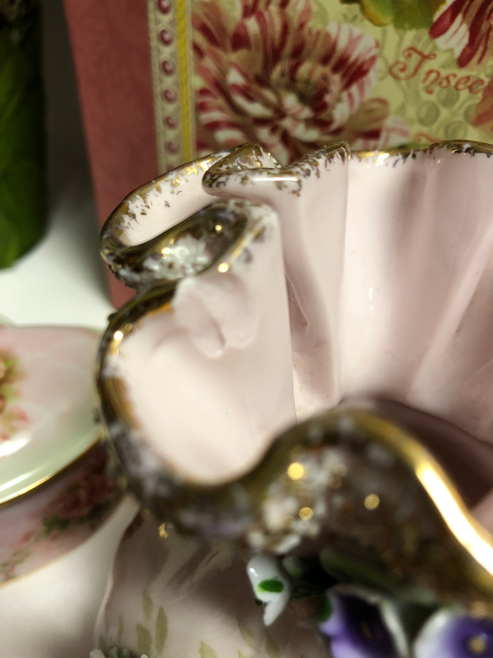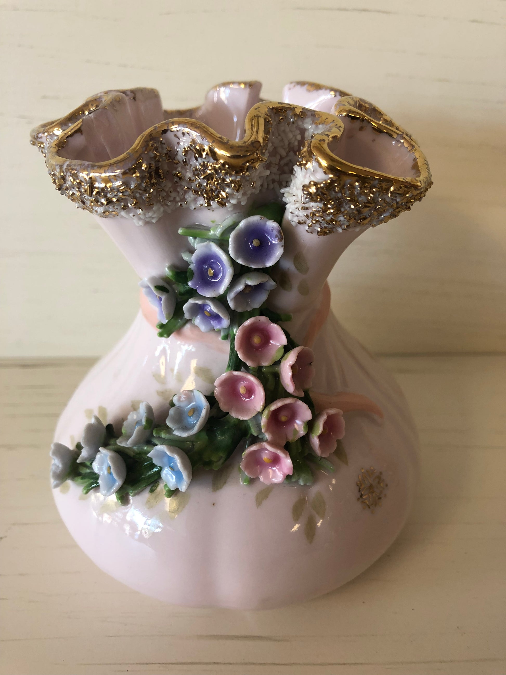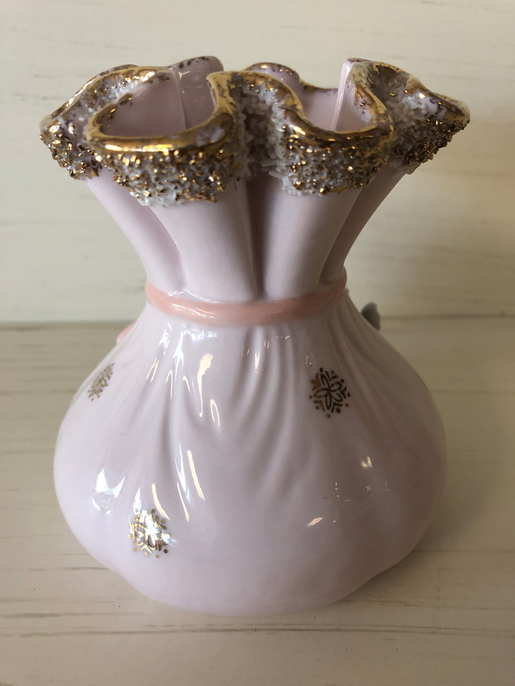 This lovely vintage Lefton pink vase is 4.5” tall with a 3.75” base and 2” opening. It does have a chip at the top (pictured) which is not very noticeable as the porcelain is pink inside.